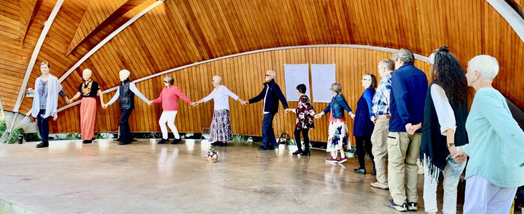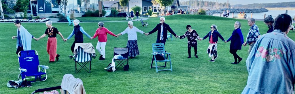 During the first half hour we dance a set of simple, easy-to-follow dances . This same set is repeated for several months so the group becomes very familiar with the dances over time.